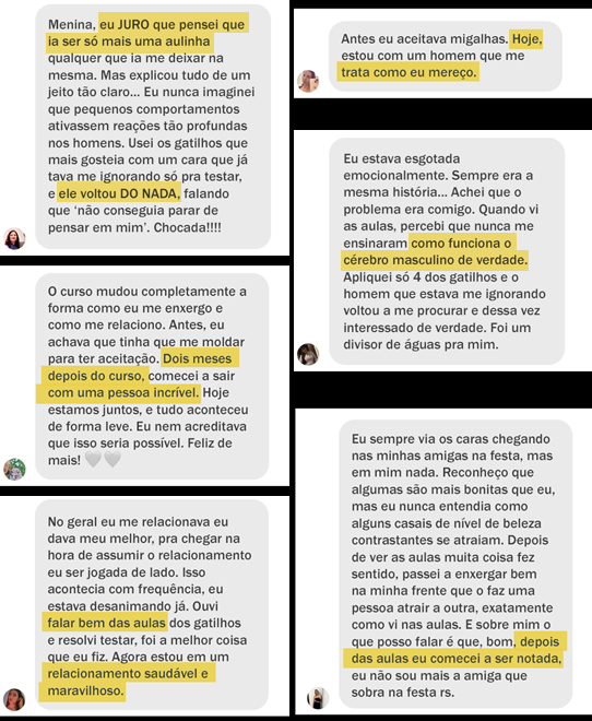 Além de dezenas de milhares de pessoas ao redor do mundo que colheram resultados através desses gatilhos, só aqui nessas aulas foram 8.627 alunas (até a última contagem) que tiveram suas vidas transformadas. Os testemunhos relatam maior sucesso em suas interações sociais, profissionais e amorosas.